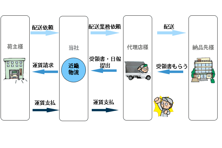 営業から契約・オーダー受注・請求業務・集金業務の他、お客様の問い合わせ・依頼に至るまで、すべて近畿物流で一括対応します。代理店様へのお仕事の依頼も近畿物流からとなります。