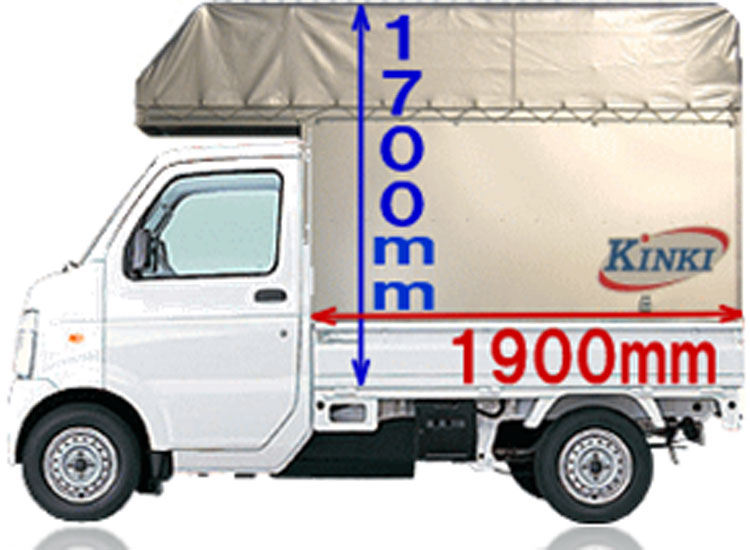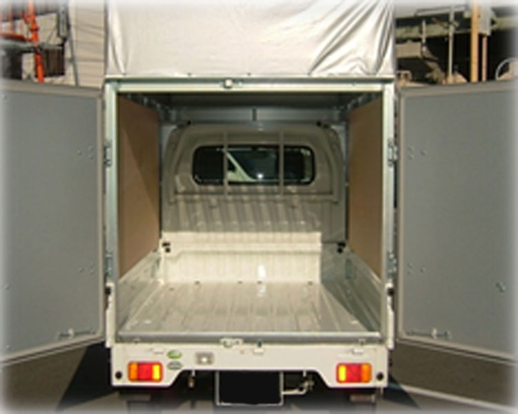 軽貨物の荷台スペースをボディ加工し、幌を高くしています。広い貨物空間が特徴です。